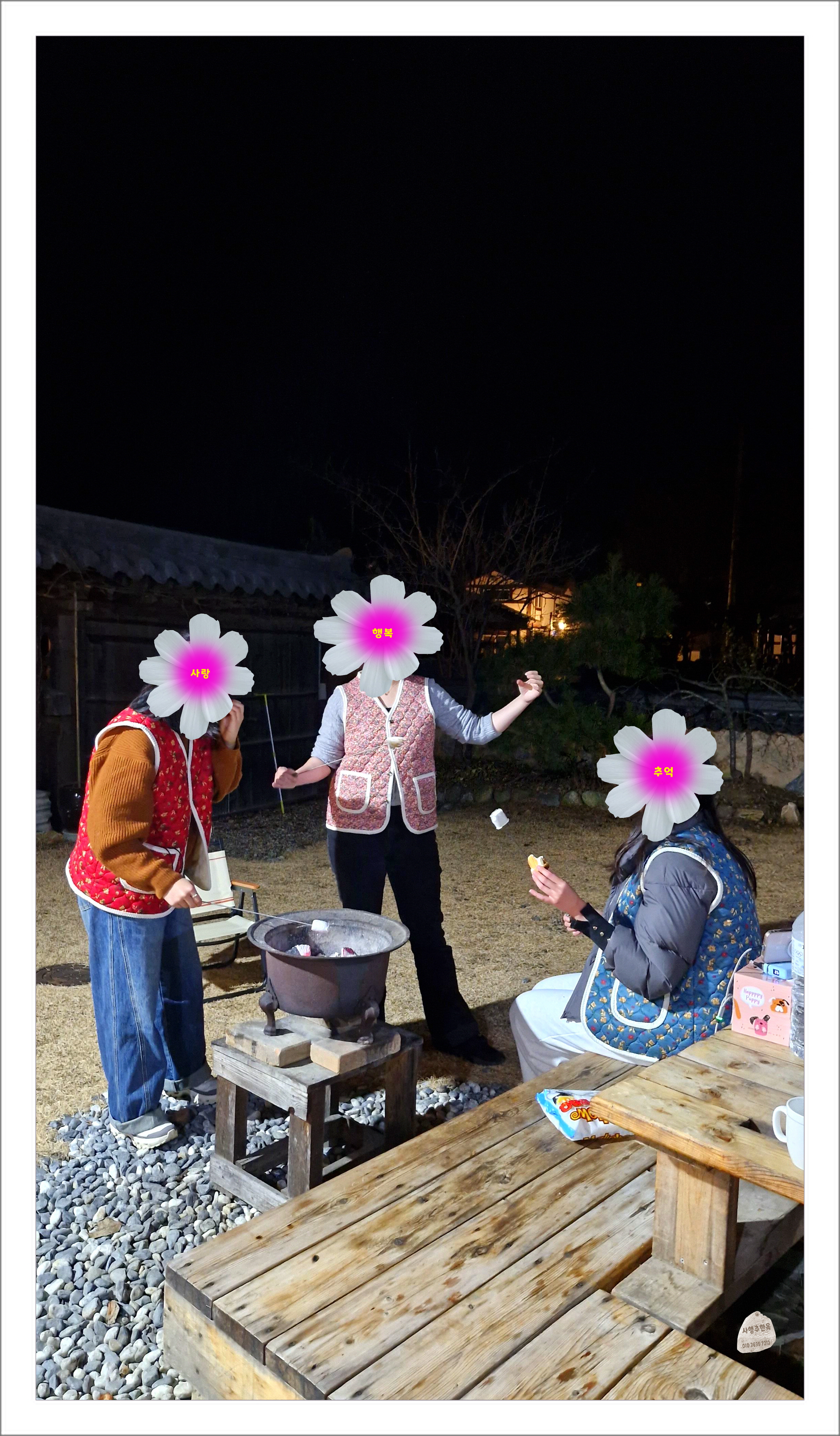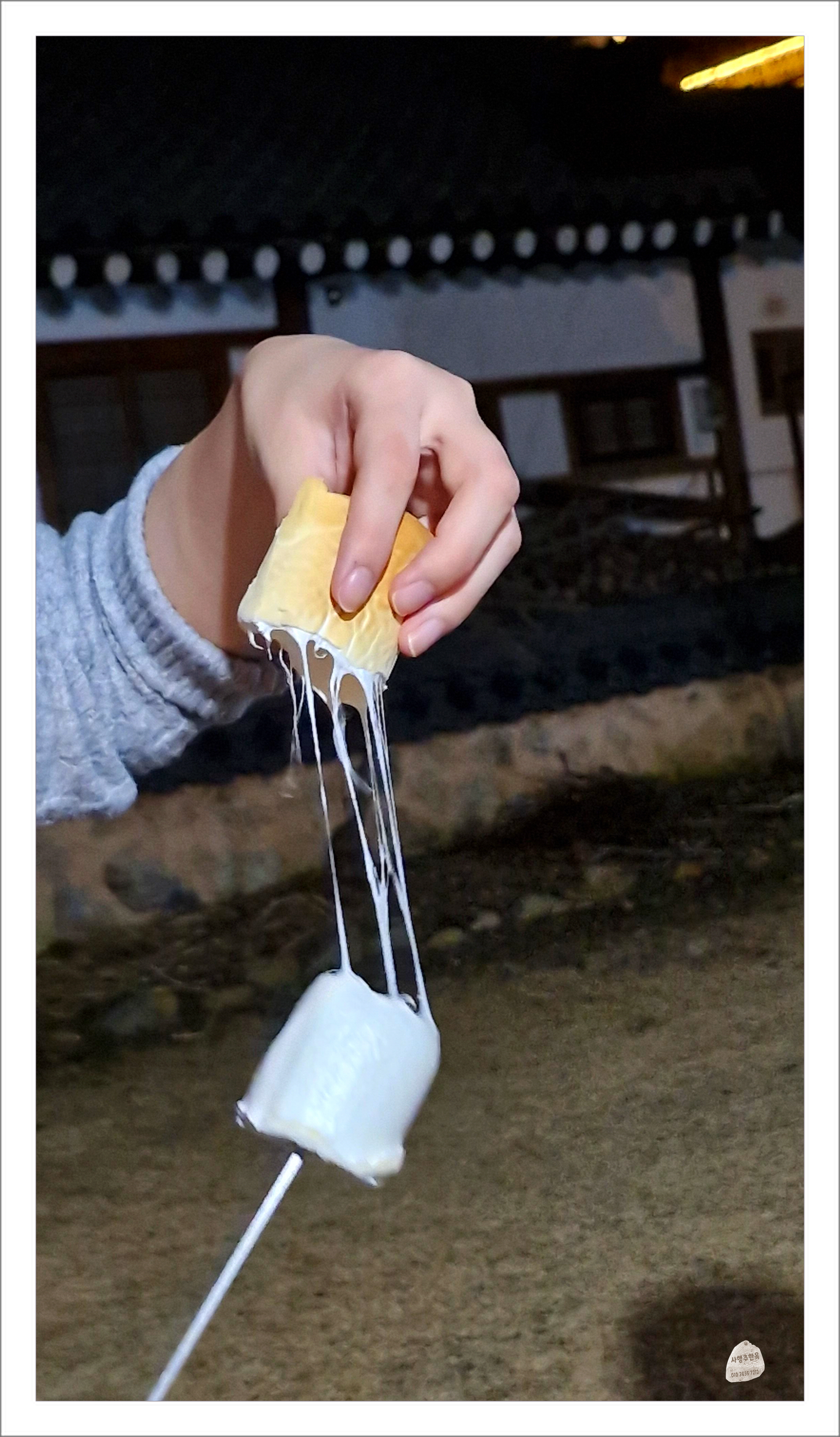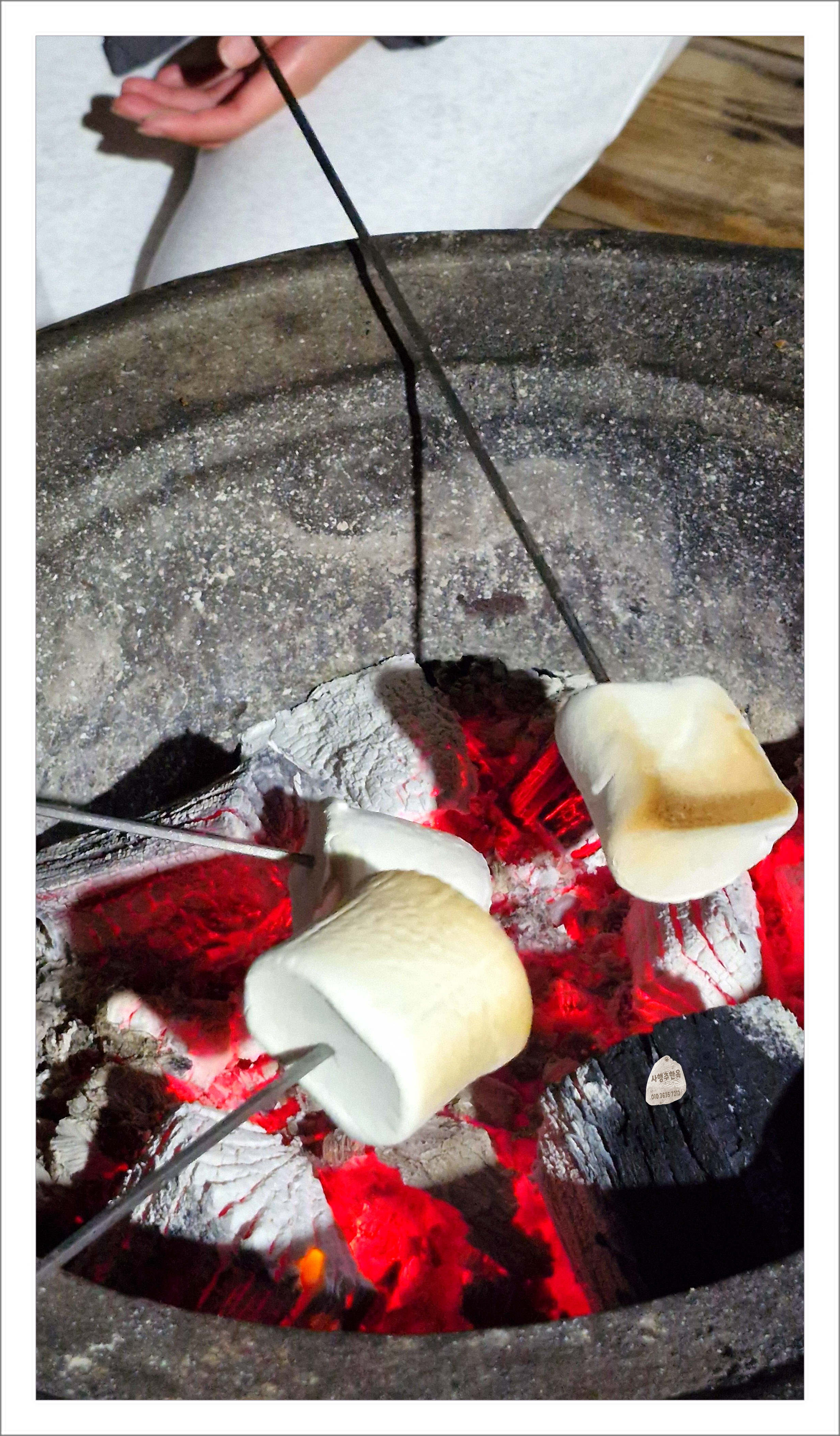 화롯불에 마시멜로 구우며